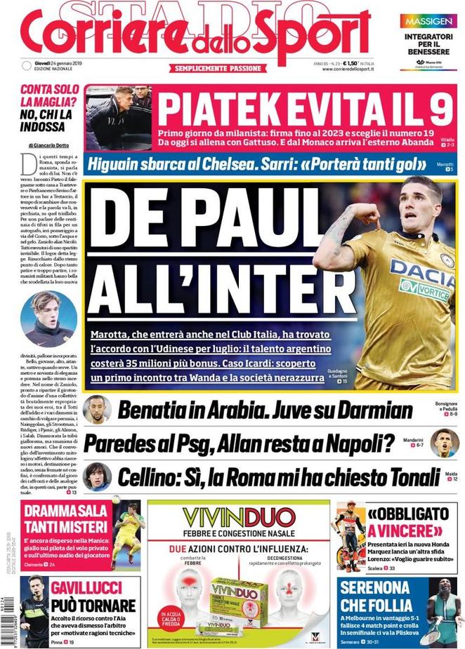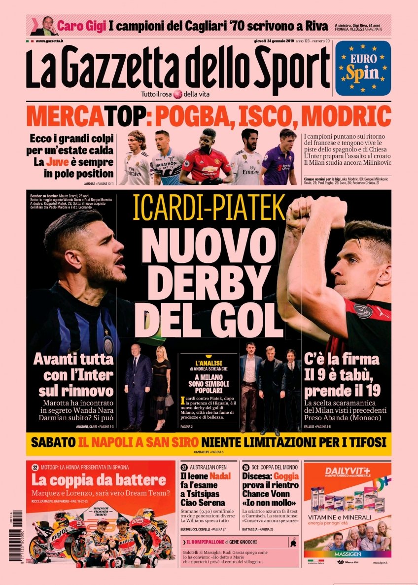 Le prime pagine dei quotidiani sportivi del 24-01-2019
