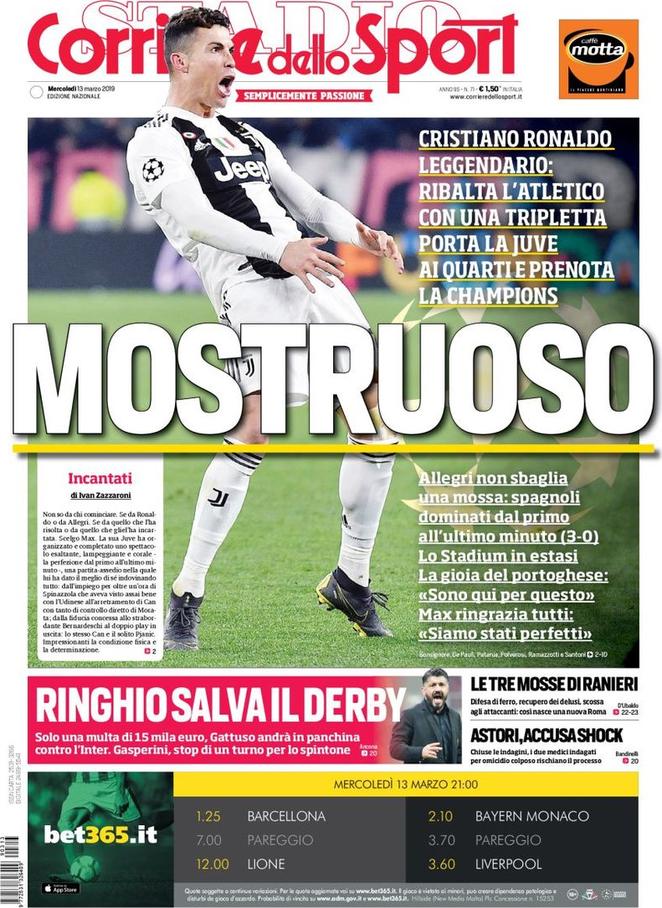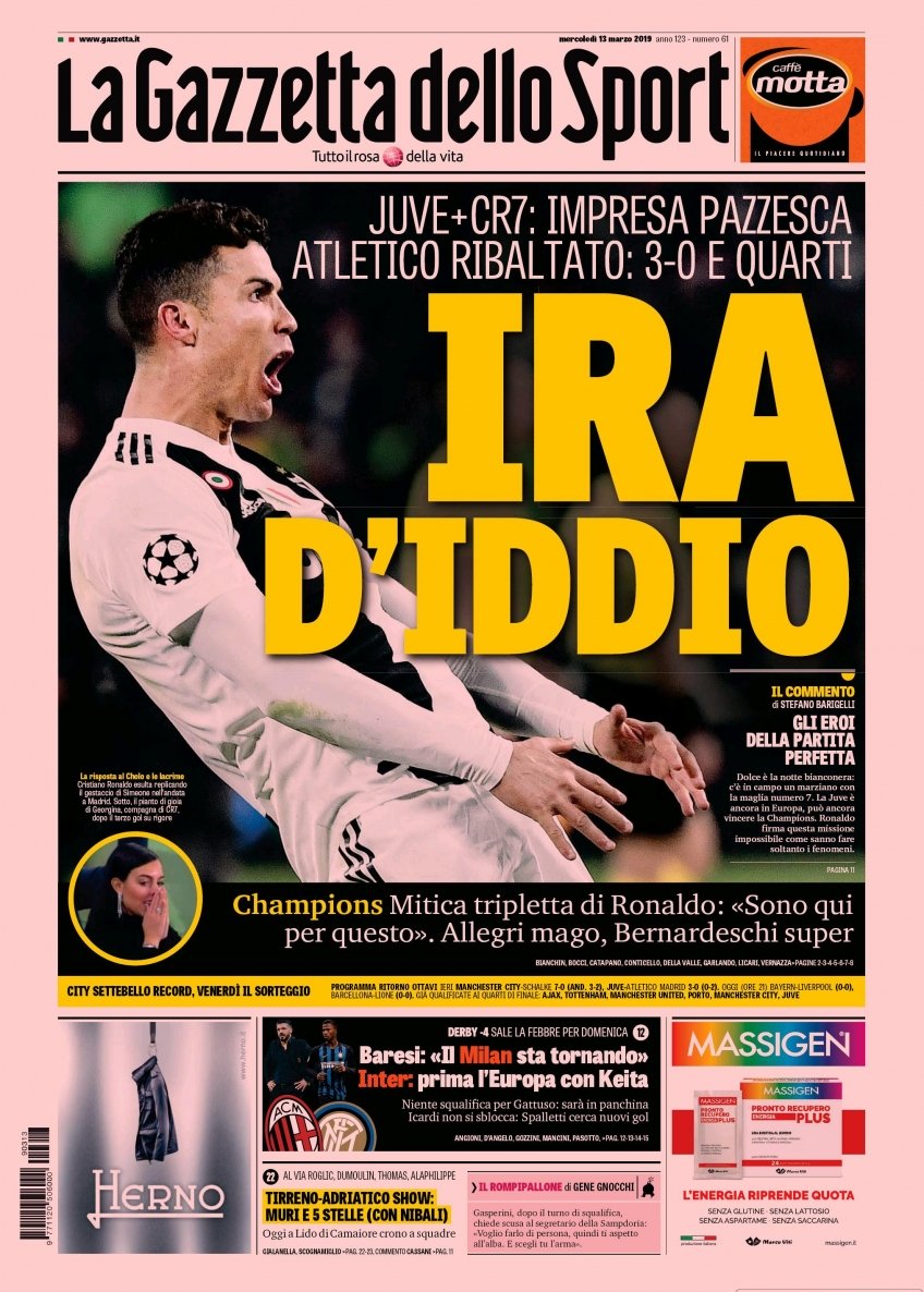 Le prime pagine dei quotidiani sportivi del 13-03-2019