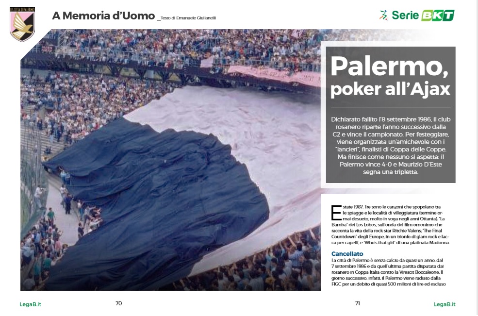 Festa per la promozione dalla C2 alla C1. Pomeriggio del 19 maggio 1988, il Palermo ospita in amichevole l’Ajax. La squadra rosanero ha vinto il campionato e affronta gli olandesi, freschi finalisti in Coppa delle Coppe. A raccontare quel pomeriggio al magazine della Lega B (qui il numero integrale) ĆØ Maurizio DāEste, il giustiziere dei lanceri. Un attaccante che di gol non ĆØ che in carriera ne abbia segnati chissĆ quanti: 61 in 288 partite.