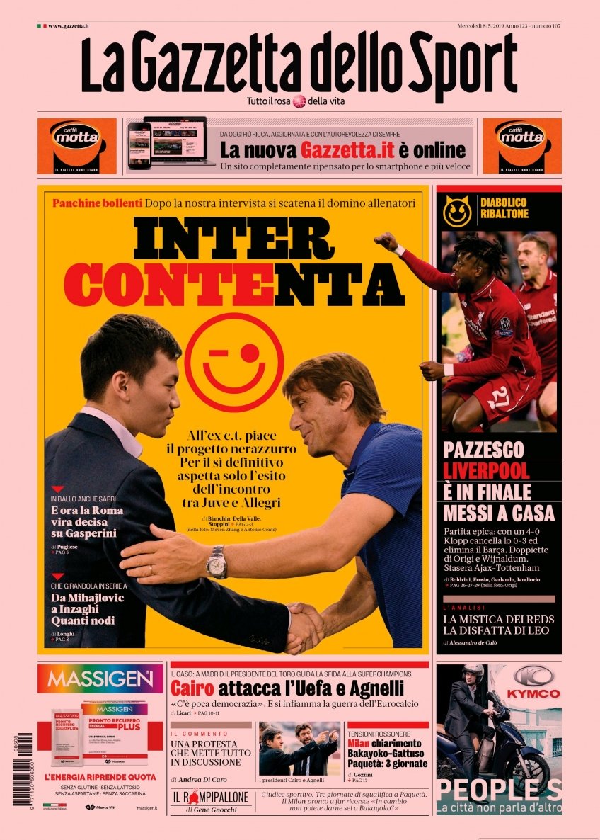 Le prime pagine dei quotidiani sportivi del 08-05-2019