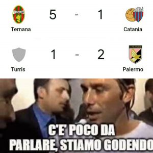 E dopo la vittoria del Palermo, i tifosi rosanero hanno festeggiato anche quella della Ternana che ha sconfitto il Catania con un rotondo successo per cinque a uno. Una rivalità che i tifosi rosanero hanno trasformato in un meme che vede protagonista Antonio Conte.